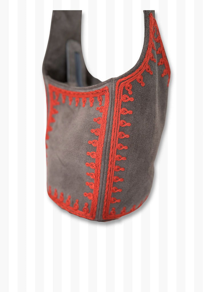 Adorned with the signature Sophie Habsburg snake buckle, this suede shoulder bag has a an adjustable strap converting it to a crossbody. Moroccan stitching, zipper closure, removable zip pouch on strap inside to hold your must haves.