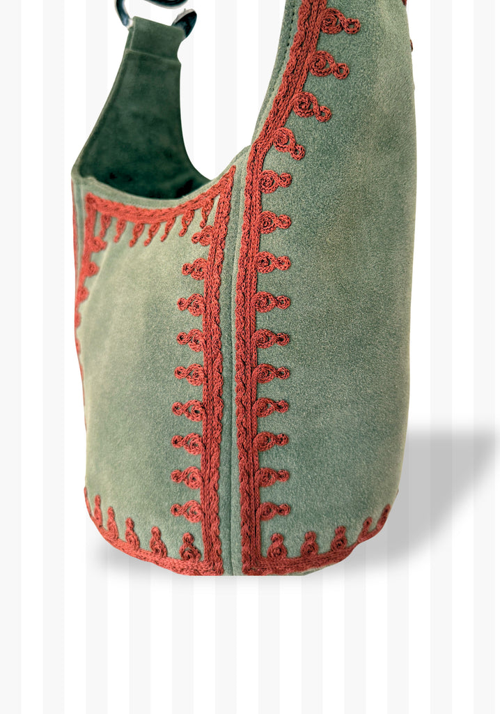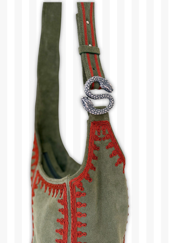 Adorned with the signature Sophie Habsburg snake buckle, this suede shoulder bag has a an adjustable strap converting it to a crossbody.  Moroccan stitching, zipper closure, removable zip pouch on strap inside to hold your must haves
