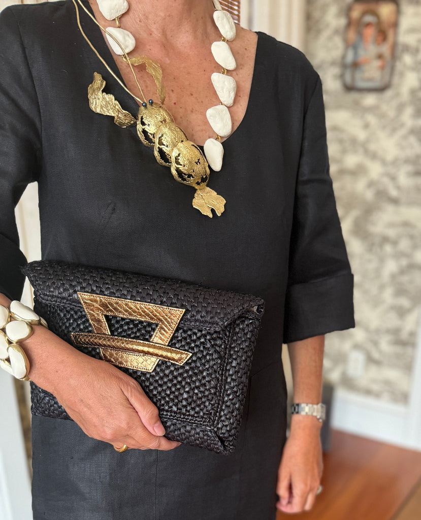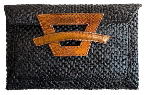 Madagascar raffia envelope clutch. Gilded snake accent. Tuck flap.