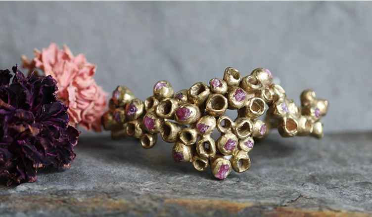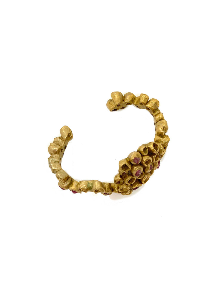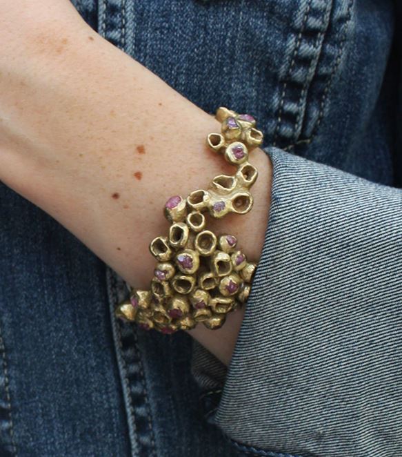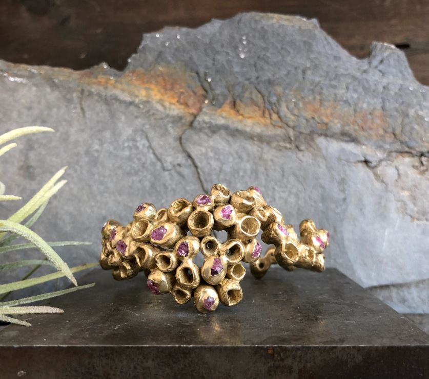 This hand carved piece is inspired by the great barrier reef with pink spinel embedded in brass. This gorgeous cuff bracelet is one size fits most. Final Sale.