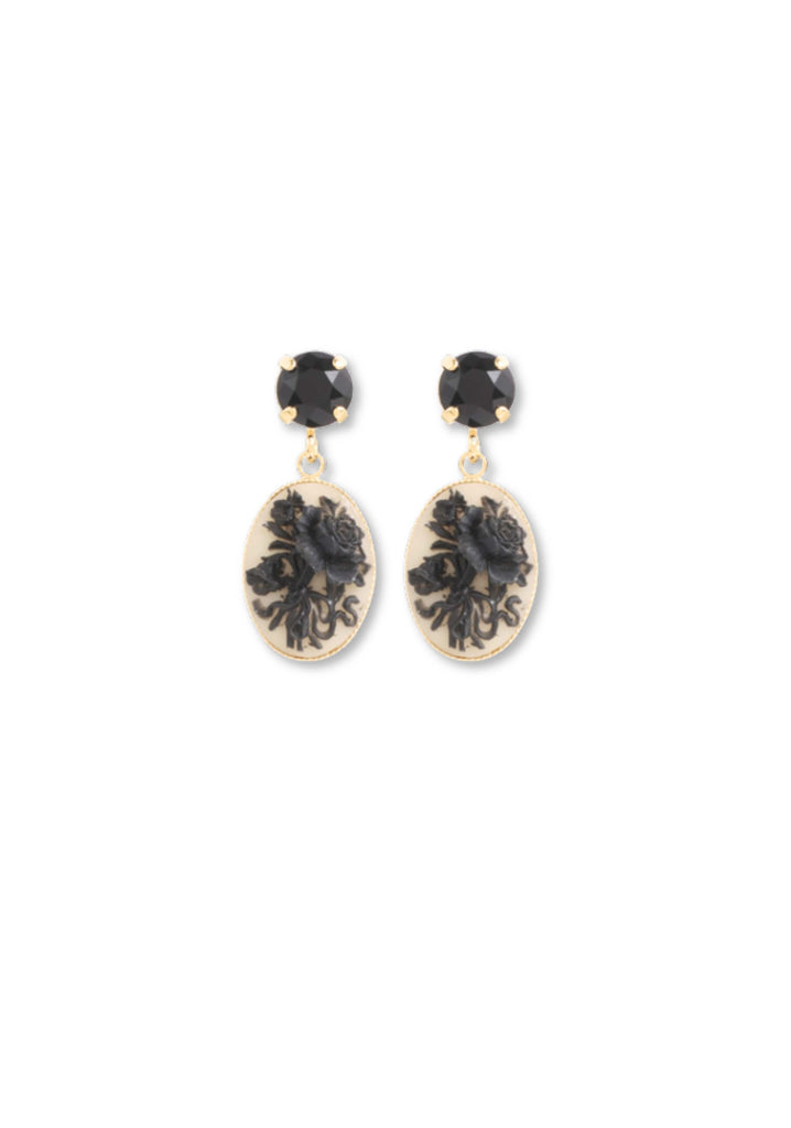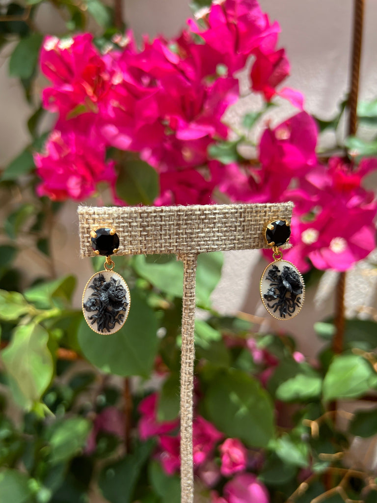 Very light weight. Antique bronze treated brass, cabochon, flower and resin cameo. Nickel free. Handmade in Paris. 1.25" long
